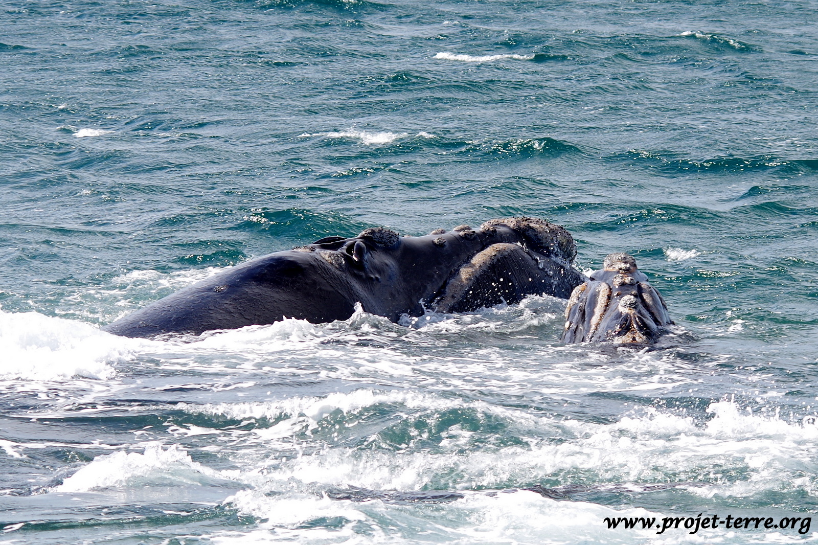 Nous partons enfin en bateau pour aller voir les baleines franches qui sont actuellement avec leurs bébés. Nous sommes en ce moment en fin de période, il y en a donc moins, mais nous avons la chance d’observer quatre mères accompagnées chacune de leur petit. C’est vraiment magnifique de les voir et très différent de la fois précédente en Equateur. Car nous ne sommes plus en période de reproduction lorsque les mâles frappent la mer avec leurs nageoires pour séduire la femelle, mais nous sommes en période postnatale…